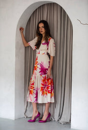 This effortlessly elegant piece features a flowing midi silhouette that moves beautifully with you. The soft cream base provides the perfect canvas for its vivid floral print, bold splashes of fuchsia, orange, and magenta come alive like petals kissed by sunlight. The result is a dress that feels both joyful and sophisticated, ideal for those golden afternoons abroad.