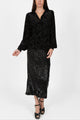 This seriously sexy blouse is a showstopper. Crafted from luxurious black velvet burnout with a striking floral pattern, it features elegant balloon sleeves with deep cuffs and a hidden zip for a sleek finish. The covered buttons add a touch of sophistication, while the stretchy fabric ensures a comfortable fit all day (or night). Designed with a slim fit through the body, we recommend sizing up if you have a larger bust for the perfect fit. Pair it with our Madrid sequin skirt for a glamorous look, or dress it down with jeans for effortless chic.